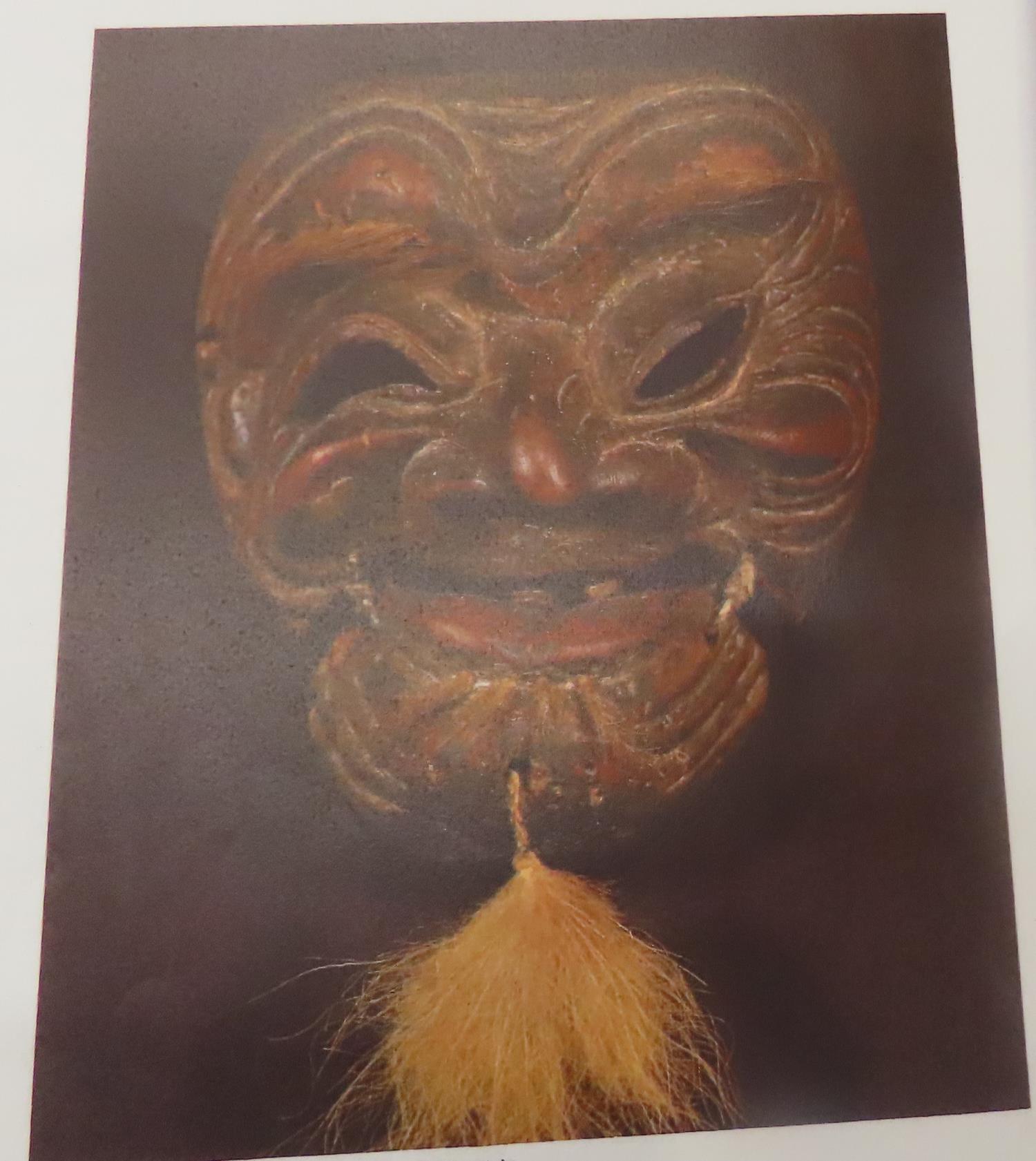 面長16.7cm、面幅14.4cm、厚さ7.4cm、桂材(けいざい)。左眼は父尉(ちちのじょう)に、右眼を翁に似た表現とする。額や頬に深く彫られた皺(しわ)、鼻梁(びりょう)の曲がり強く張る様など、後の能面には見られない荒々しい意識表現が見える。一見、粗野な老顔(ろうがん)だが、神社の御神体(ごしんたい)にふさわしい緊張感がみなぎる。鎌倉時代の作と考えられる。