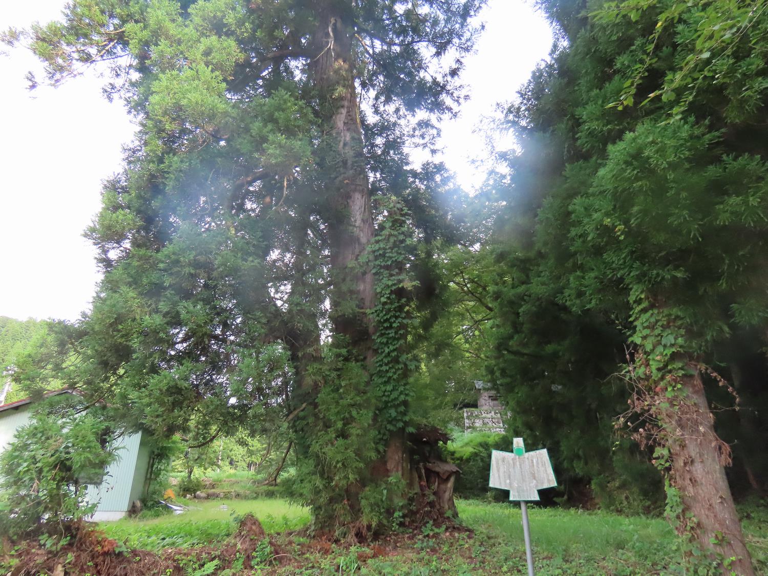 双幹立ちの見事なものであったが、一本は落雷のために焼かれて伐採された。残された一本は周囲が7m余ある。